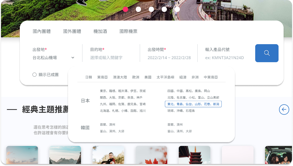 新的體驗從「旅遊地點」和「條件篩選」這兩個搜尋功能能開始,比起關鍵字搜尋,大多數的旅人者更習慣先選擇地點以及想要篩選的條件,這樣的介面調整也讓使用者對我們的產品有更多的信任。因此整合旅遊地點推出了「旅遊地點選擇器」,這讓使用者可以透過點選的方式選取感興趣的旅遊地點,完全不需要手動輸入。